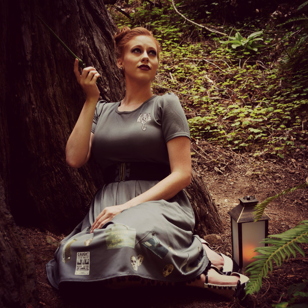 This beautiful dress from Mud In My Blood is perfect for the office or for bounding off to the theme park. It features assorted dark objects and a towering stack of cauldrons on the skirt.