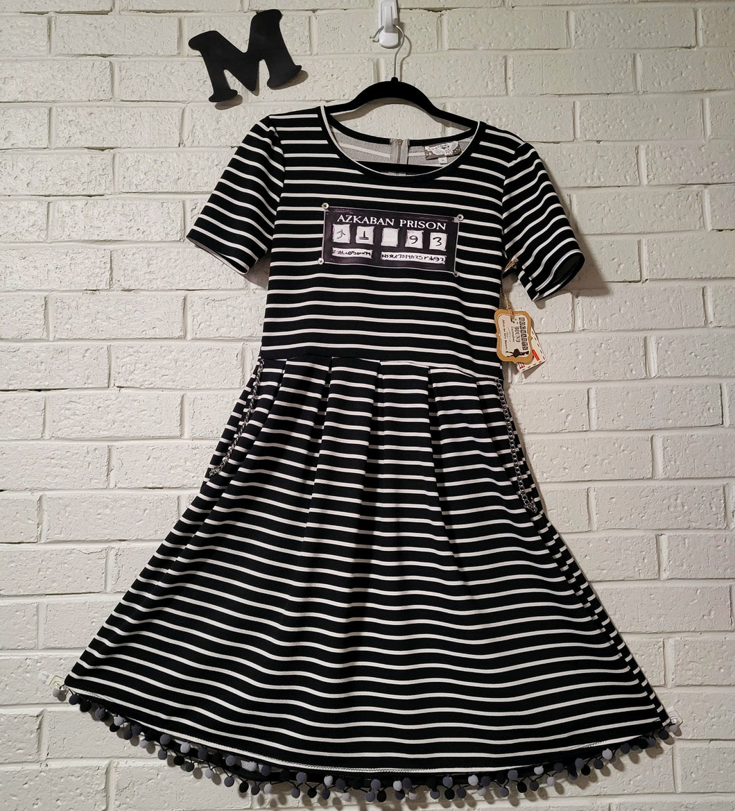This beautiful dress from Mud In My Blood is perfect for the office or for bounding off to the theme park.  It features prison uniform stripes and the placard from mugshots.  This particular dress also comes with gold tone chain details that look like they could be... shackles?