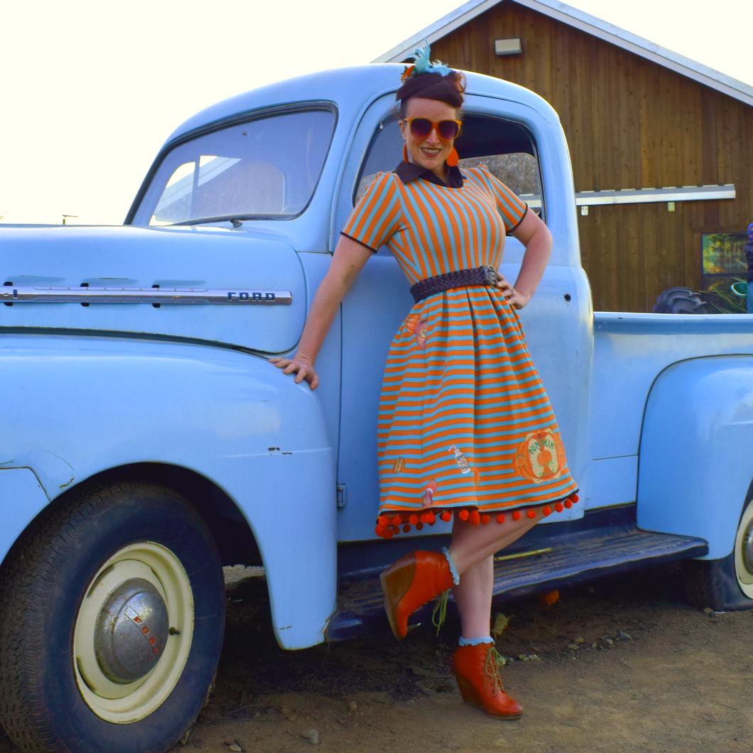 This beautiful dress from Mud In My Blood is perfect for the office or for bounding off to the theme park.   Mint and orange stripes and offset by Pumpkins and juice dancing around the skirt.